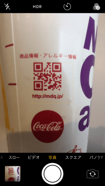 マックシェイクの容器にもQRコードが ついてます。こんな感じで、カメラアプリを起動 させてQRコードにかざせば、読み取ることができます。